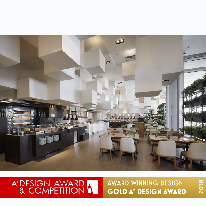 OPERATION / FLOW / INTERACTION: This buffet is equipped with an attractive open-kitchen. However, unlike a conventional buffet counter where guests and service side are completely separated, by taking a migratory long table as a buffet counter which is the high-light for the restaurant in operational aspect, so that it makes the boundary between kitchen and dining areas ambiguous and neutral, bringing staffs and customers more intimate and enabling friendly communications between them. It is designed based on a hope that the space is filled with warm communications by sprinkling "gathering" atmospheres wholly.