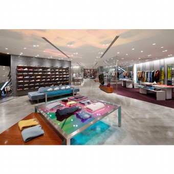 PRODUCTION / REALIZATION TECHNOLOGY: Colored hologram films are used for the partition walls and fixtures change to various colors depend on the viewing angle and light adjustment. The area surrounding the public escalator was also used as an unique part of the store.