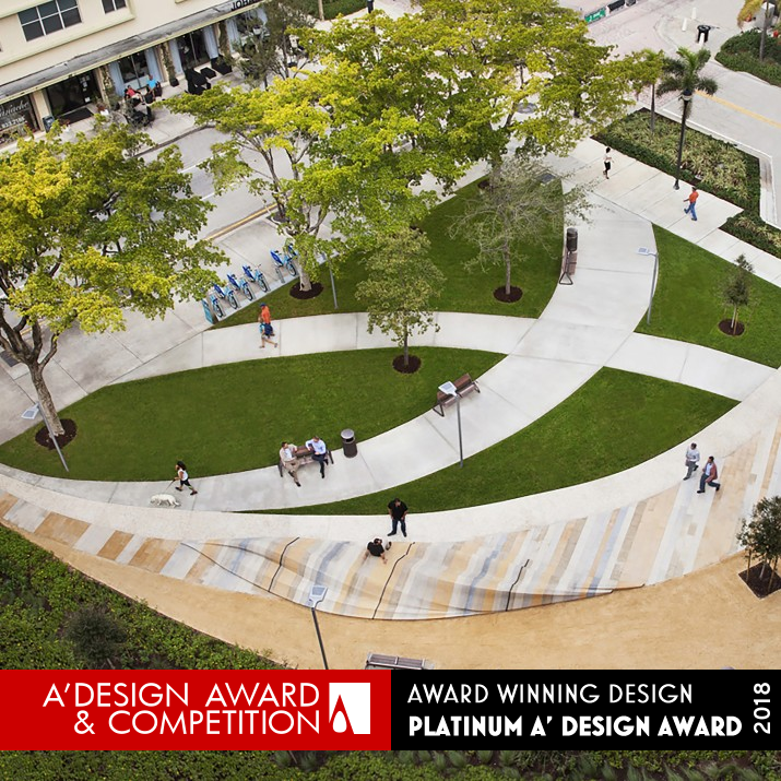 With its light colors and smooth flowing form, the sculptural bench evokes images of the sand and waves. A carpet of green grass envelopes the stone island oasis. Visitors can sit in the shade of the canopy trees and view the integral art piece or interact with the sculpture itself, finding ways to sit, stand, lie and climb on.
