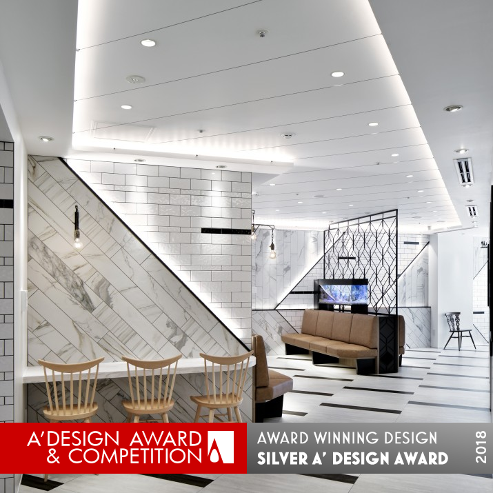 UNIQUE PROPERTIES / PROJECT DESCRIPTION: The geometric pattern tiling and the dimensional lighting were applied to the lounge space. To develop a new design language, we applied several geometric patterns to the floor, walls, and ceiling with the emphasizing lighting system, and then we combined those aspects very carefully. While using two types of ceramic tiles for each wall, we decorated them in different directions to each other and tried to create some kind of the design movements to the space.