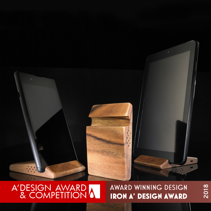 INSPIRATION: A pocket holder for phones or tablets, as small as it gets, using the most of its shape and volume for as many functions as possible. The softly shaped oblique lines define the ergonomic usefulness of different phone positions, ensuring stability, multifunctionality and an open screen. The volume of the body is hollow and filled with electronics. But most of all this is a pleasant piece of wood, a piece of living nature combined with sophisticated electronics, that can conveniently be used as a mirror.