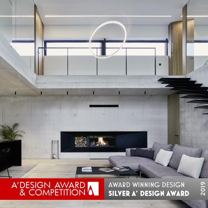 The interior maintains the building’s ascetic image - here rough concrete plates and extensive glazing are dominant. A feeling of cosiness is generated by the natural oak surfaces and carefully designed elements such as the fireplace slab and the ornamental metal stairs. The combination of inbuilt lighting fixtures, concealed within and hanging from the surfaces, offers countless lighting scenarios, which can even be easily controlled by smartphone, thanks to the application of smart house principles.