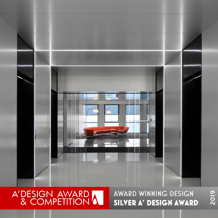 PRODUCTION / REALIZATION TECHNOLOGY: Environmental friendliness is a primary design principle. Various natural and reusable materials such as aluminum, wood, ceramic tile, etc. are used for hard and soft furnishings in this project. Designer believes that it is not necessary to use luxurious materials in office space design. Appropriate use of green materials can reduce waste and pollution. The use of sound-absorbing material is another highlight of the design. The perforated sound-absorbing cellular aluminum panelled ceiling above workspace, anodised aluminum paneled walls and ceilings in elevator bank and hallway, along with carpeted floors all contribute to noise reduction and better productivity.