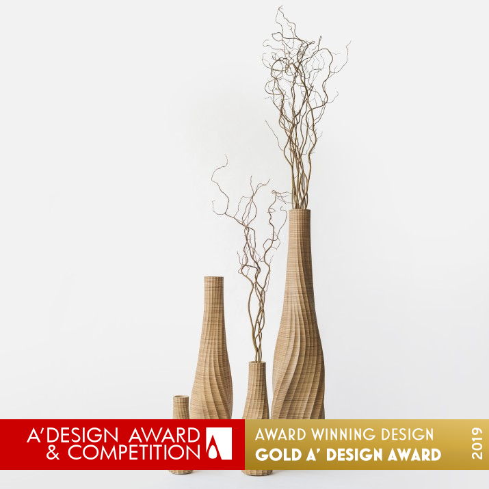 UNIQUE PROPERTIES / PROJECT DESCRIPTION: Aestus is a series of stratified wooden vases exploring a new synthesis of traditional materials and modern technology. Carved from hundreds of layers of wood by an industrial robot, the vases capture the fluidity of the machine's movements in the depth of the wooden texture. Aestus is both a story of material exploration and of technical prowess. Each of the four vases is an expression of the aesthetics of a modern manufacturing process, as well as a statement for contemporary wood design.