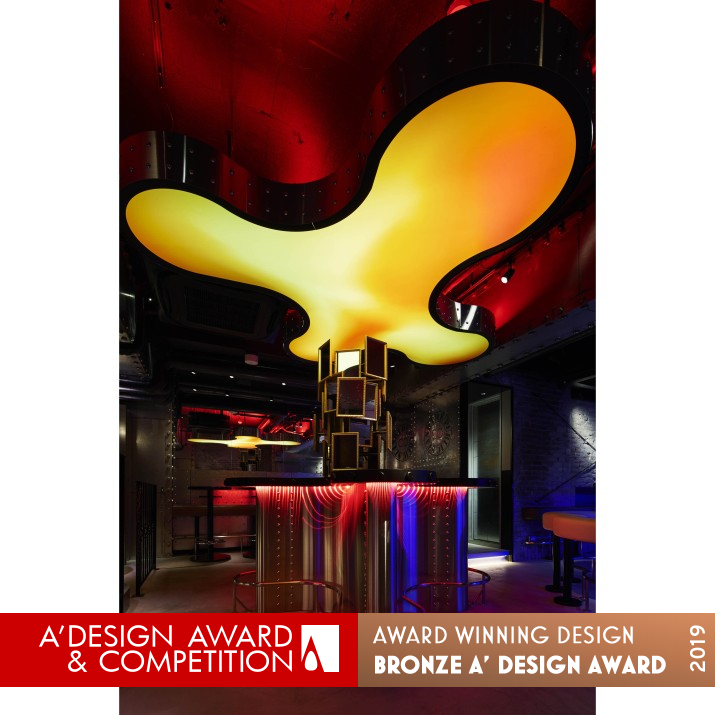 UNIQUE PROPERTIES / PROJECT DESCRIPTION: This is a standing bar where young people come for encounters. The underground location makes you feel like you are going into secret club, and the colored lighting throughout the space pumps up your heartbeat more with the graffiti. As the purpose of the bar is to connect people, we tried to design organic, circular shapes. The big standing table at the end of the bar is ameba-like shape, and the shape helps customers to get closer with other people without making them feel uncomfortable.