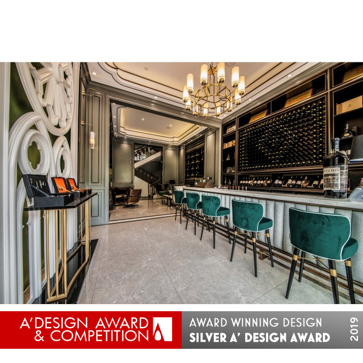 PRODUCTION / REALIZATION TECHNOLOGY: Below the dome, this designer combines the black door head with the entrance curtain wall, appearing more dignified and generous. The whole layer is mainly made of grey decoration panel, white paint, black wood, with bronze color and dark green decoration. The cigar cabinet is made of pine wood, and the temperature in the room is controlled by the thermostat system, which reaches 24 hours constant temperature and humidity, facilitating the preservation of wine and cigars.