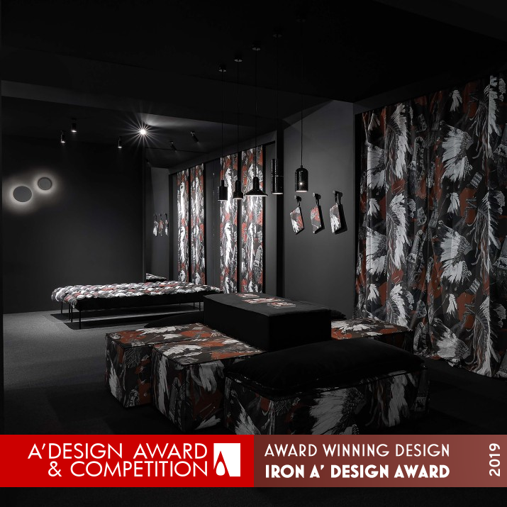 INSPIRATION: The project was the creation of a themed lounge area based on a particular patterned fabric. The pattern was redesigned by our team and composed the inspiration for the project, as it draws direct elements from the culture of native Americans providing a wide scope of cultural background to be applied and to work with. All the products and the ambiance of the space created were under the same line. The ambiance was of a special focus point, as part of the points of communicating the design, was trying to convey parts of the mysticism involved in the culture.
