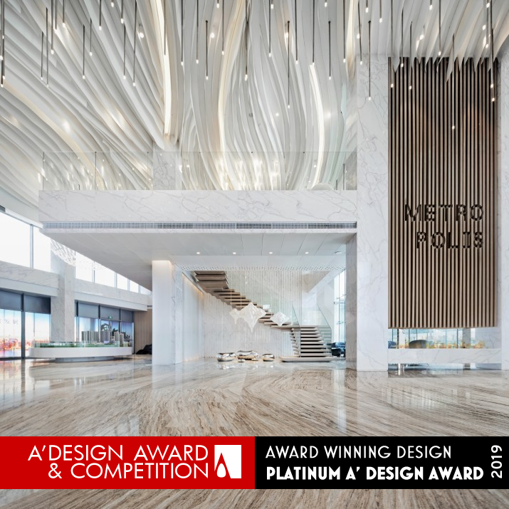 PRODUCTION / REALIZATION TECHNOLOGY: From the bottom to the top, the space structure varies from complicity to simplicity. The suspended ceiling is elaborately decorated with curve paper ribbons and artistic lights, imitating the glistening river which echoes the textural floor. The lightness, figurativeness, smoothness, and glossiness of the space all highlight the modern aesthetics. Under the hard materials like ivory white marbles, transparent glass, acrylic boards and natural wood, there exists a space of quietness, softness and changes.