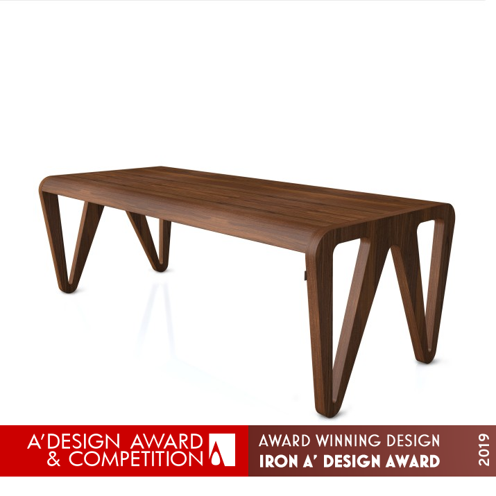 PRODUCTION / REALIZATION TECHNOLOGY: The underlying idea of the design is to have the "A" of the logo come back in shape in a table design. The challenge of this final design is to have the shape of the A on the ends of the table serve as the support for the top. And with this you create a design like that, where you can only sit on the long sides of the table and therefore the design of the table always remains visible. That is also the idea behind this design. Because the table is made of solid walnut and / or oak wood, it is built up in layers and glued.