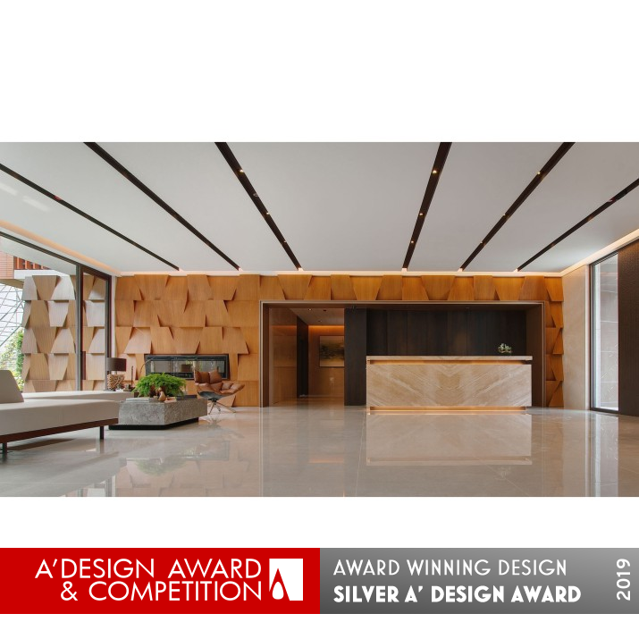 PRODUCTION / REALIZATION TECHNOLOGY: The main public areas in the room are based on white and dark wood veneers, creating a warming and fictional atmosphere. The ceiling of the hall is made up of horizontal strips to create a modern and minimalist texture, subtly embedded with light. The walls are made up of three-dimensional wood, stacked in trapezoid shape. With the hidden cabinets dug in part, the natural materials and the unique warmth are brought into the room while creating rich and colorful layers at the same time.