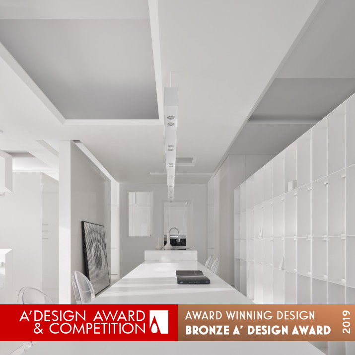 Three white houses are laminated together. The big opens scatter on the wall are used to introduce light from surrounding and sky, allowing mutual penetration among the subjects and breaking the lines between spaces. The “box inside box” idea is adopted to have four layers in different sizes to inlay each other.