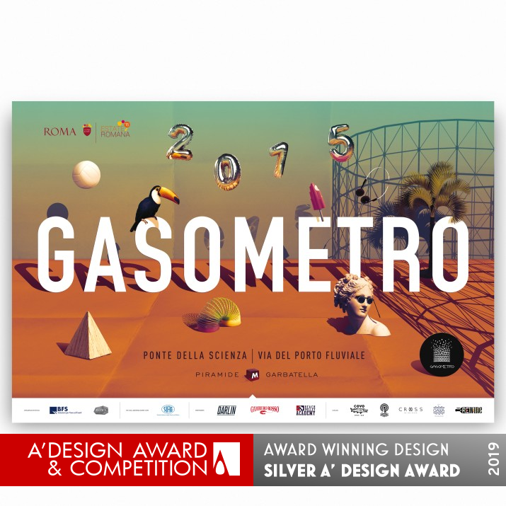 UNIQUE PROPERTIES / PROJECT DESCRIPTION: This Adv was made for a summertime event in Rome, 2015. Food, drink, party and culture are the core of this entertainment event. The ad is a mix of iconic symbols of event's concept that floats around the big typography Gasometro, while the color palette refers at summer sky at sunset, it’s exactly at the sunset that the event starts. Another relevant symbol is the shadow on the background: it shows the Gasometro, a big structure in the location that gives the name at the event.