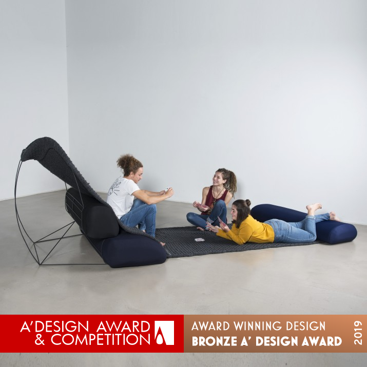 UNIQUE PROPERTIES / PROJECT DESCRIPTION: Isiqu spreads in space and makes you feel good. This hybrid sofa allows the user to work, sit comfortably, alone or with others, surrounded by materials and shapes that give free rein to his imagination. Its knit and hand-made covers highlight this soft and strong object. A structure that proposes and doesn't stuck the object in a specific use.