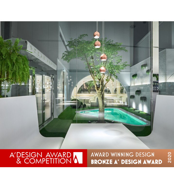 OPERATION / FLOW / INTERACTION: The interior decoration, to manifest the conforming style as the building exterior, creates the slick style in the rectangular space, in which the ubiquitous elegant curves encompasses the rounded corners of the woodworks, curved ceiling and streamlined booth seats. The golden lighting fixtures, meanwhile, imaginarily bear resemblance to the whale’s blowing bubbles floating upward till the ceiling. The laser engraving screens symbolizes the swaying seaweeds.