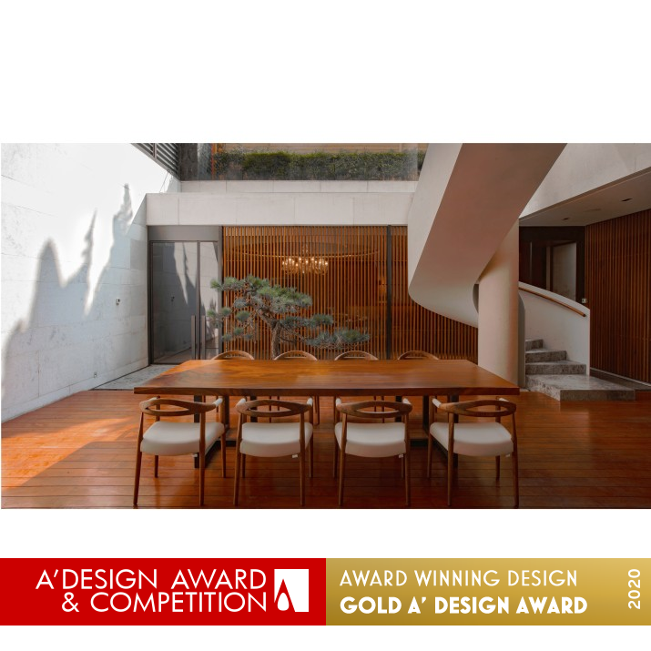 The sunken courtyard provides a serene space. When the 9m-wide electric door at the courtyard opens, transparent glass and wooden grilles perfectly introduce natural light into the sunken courtyard, presenting a bright and open space.