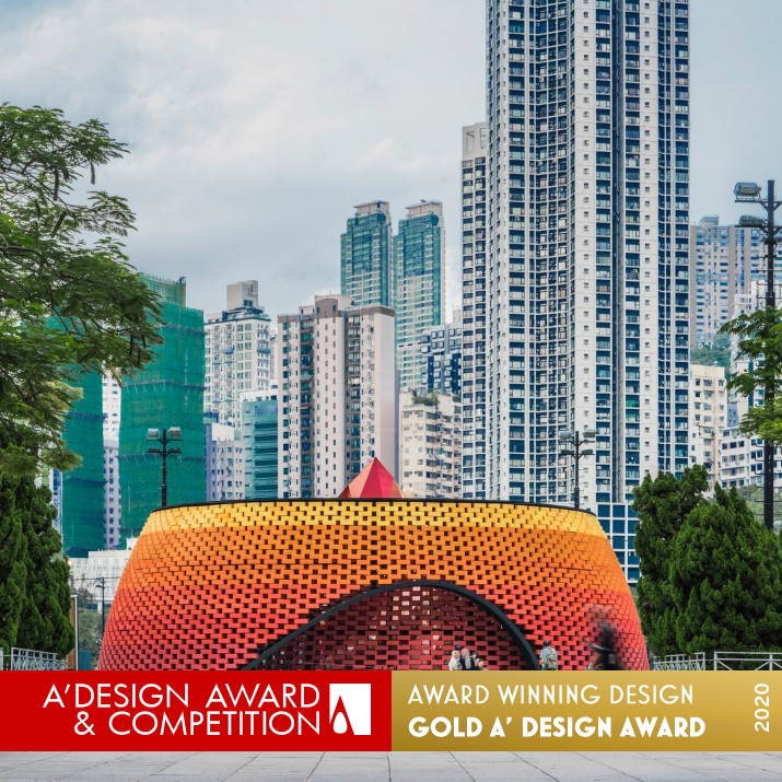 INSPIRATION: Wishing Pavilion inspired by the unique custom of the burning tower, the masterpiece of bricks. The reinterpretation of burning tower transformed into contemporary architecture. The design with a curved facade formed a double helix structure, which created imagery of rising dragon and burning tower signature architectural features. Nearly five thousand pieces of recycled plastic bricks made of HDPE used to construct the pavilion.