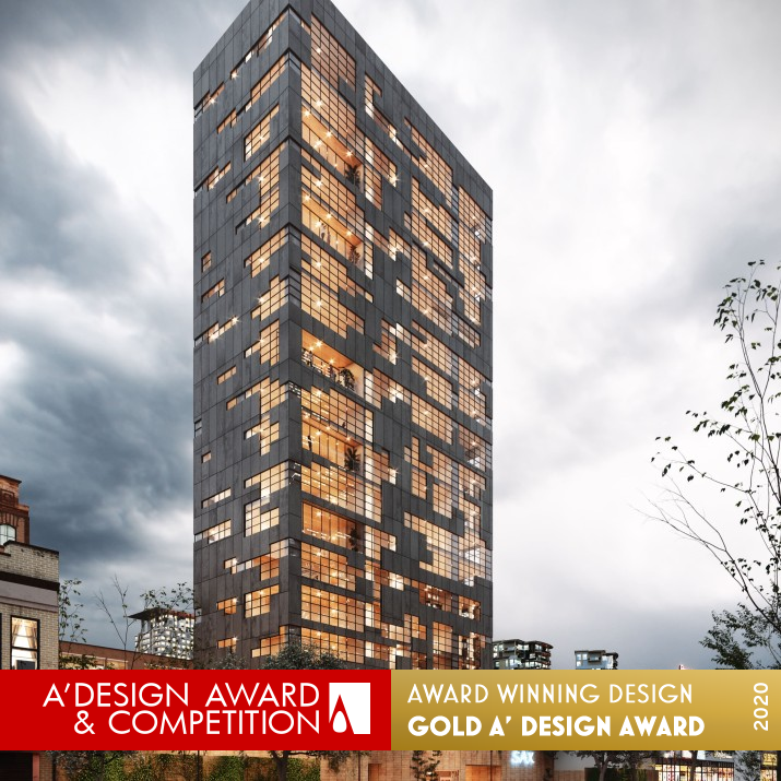 INSPIRATION: The facade comes from an idea, the brick game. This old version had the same principals of the nowadays popular game but in a old black and gray version. The four facades are clearly inspired in a random placement of the Tetris game shapes forming the walls and windows of the building, meanwhile the dark tones in the materials is based on the abscene of color in that particular old version that the young future architect treasured for years.