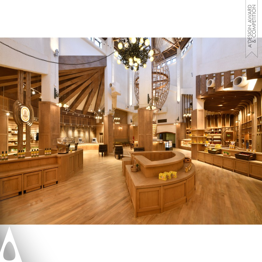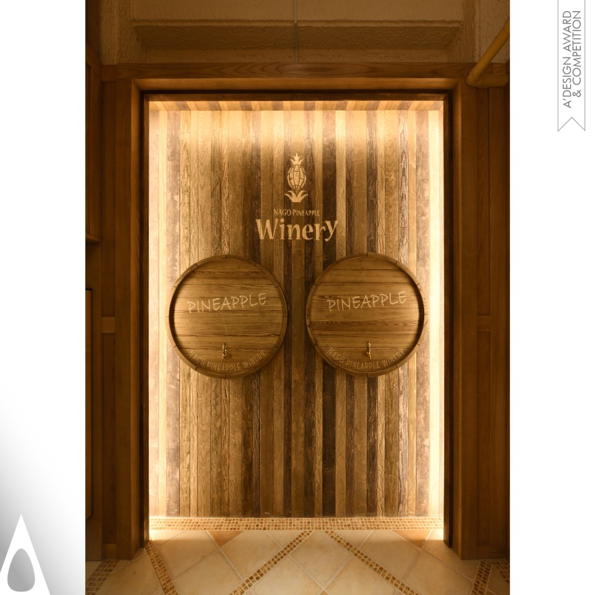 The huge object designed in the atrium space forms a focal point with its overwhelming presence. Made of steel, the object is reminiscent of a pineapple wine brewing machine. Heikki Shinjiro imagined a space that would symbolize the next 100 years of Okinawa, a time of transformation for the facility. The project team for the Nago Pineapple Park Winery aimed to create a space where adults can enjoy the image, taste, and color of pineapples.