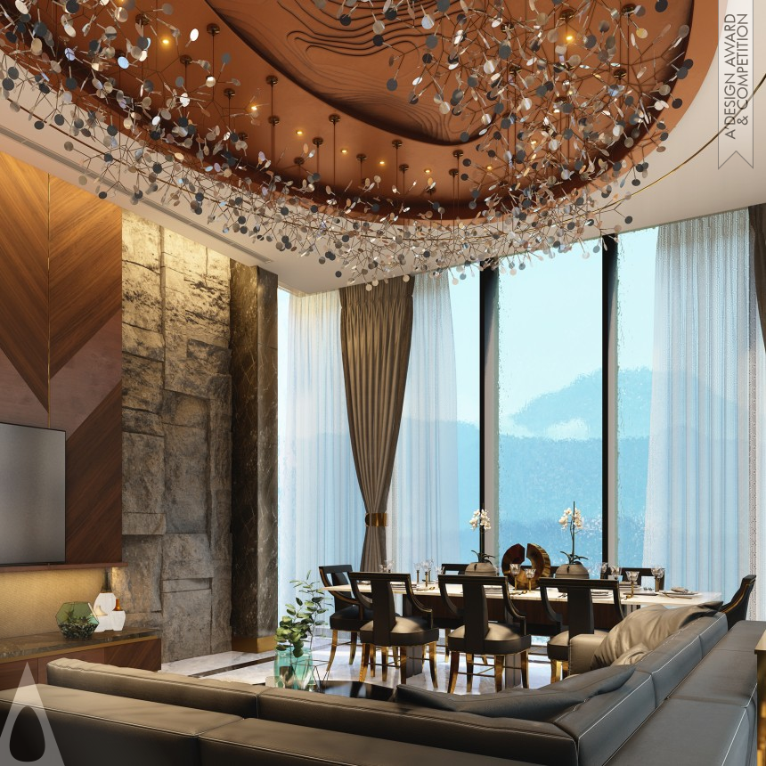 Mount Kinabalu is located in Northern Borneo. The inspiration for the entire design came from the earth-toned colour palette and the material was selected as it is warm and serene. The feature wall uses the natural rock collected from Mount Kinabalu, with the enhancement of lighting illumination from the ceiling, it does clearly shows the texture of the rock. The combination of stone and timber creates a balance of harmony. While the details of the furniture use leather and gold finishing to symbolize luxury and deluxe.