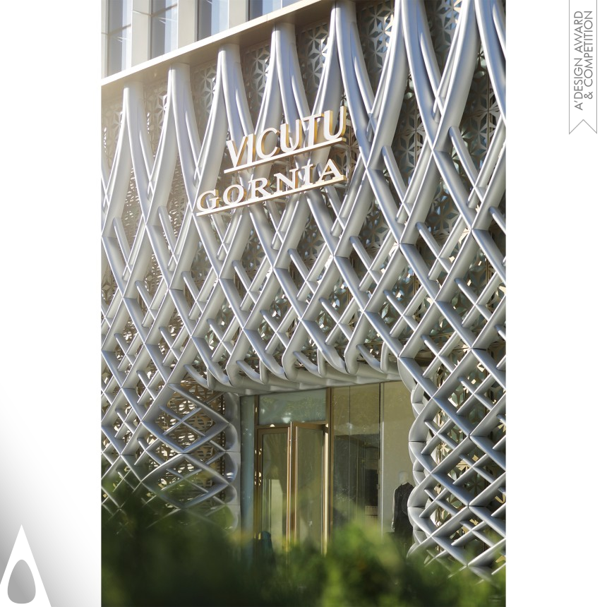 The Concept Store for the Vicutu Fashion Brand, located in Beijing urban area, provides customers with a unique experience. A large-scale three-dimensional metal weaving system is adopted, which reflects the production process and fabric properties of men's clothing on the facade. Within the interior of the concept store, the whole space language simulates the phenomena in nature, creating an immersive place for the visitors. Throughout the store, the woven diagrid language creates unity through its varied expression and implementation as detail.