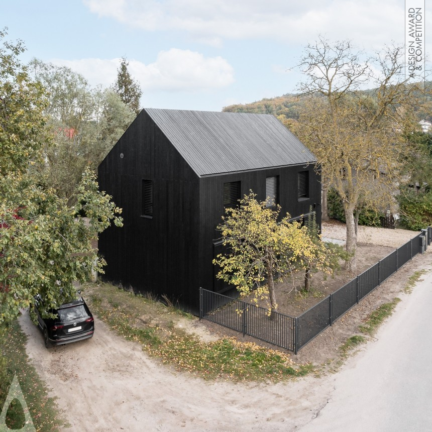 Realization of the reconstruction of a farm building from 1940, in a district of the city, which is a remnant of a former village. Beautiful location in a valley surrounded by forest and next to fish ponds. The reconstruction assumed a reference in the body and finish of the building's facade to the former barns. Attention to detail, respect for the history and tradition of the place, and the character of the buildings of the old village. The facade and roof were made of charred boards Scandinavian spruce and Siberian larch, and automatic shutters refer to the barn gates.