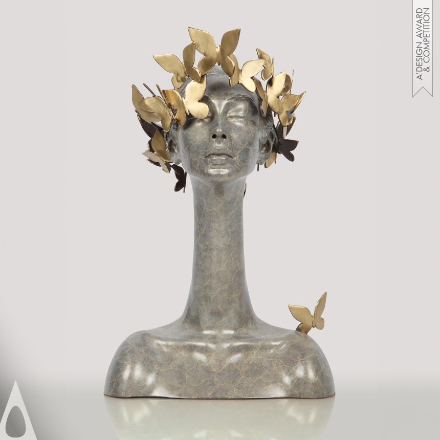 The sculpture reflects the artist's interest in humanity's connection with nature, contrasting physical reality with the spiritual realm. It symbolizes change and life's fleeting beauty by combining human and butterfly forms, highlighting the contrast between art's durability and nature's transience. The piece aims to capture and preserve transient beauty. Its intricate design features a contemplative woman adorned with butterflies, symbolizing freedom and transformation, with a marble-like bronze surface enhancing its aesthetic appeal.