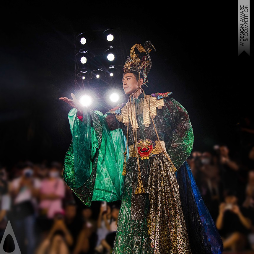 Drawing inspiration from the attire of Guan Gong, the deity worshipped at the Puji Temple in Daxi, Taiwan, boasting over a century of intangible cultural heritage. This work challenges the representation of Eastern deity culture through Western three-dimensional tailoring. Simultaneously, it employs digital algorithms to explore the application of textile technology in traditional hand-embroidered works, aiming to reduce weight and enhance durability. Main techniques embroidered fabric labels, embroidery, and the application of mixed media in ethnic stage wear design.