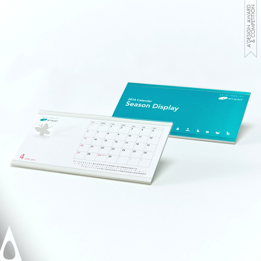 This is a desk calendar made with a cut-out design featuring seasonal motifs on exquisite embossing. The highlight of the design is when displayed, the seasonal motifs are set at an angle of 30 degrees for best viewing. This new form expresses NTT COMWARE's novel flair for generating new ideas. Thought is given to the calendar functionality with ample writing space and ruled lines. It's good for quick viewing and easy to use, brimming with originality that sets it apart from other calendars.