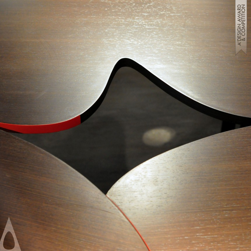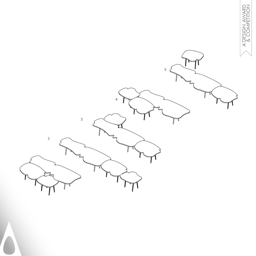 This table was designed by Bean Buro principle designers Kenny Kinugasa-Tsui and Lorene Faure. The project was inspired by the wiggly shapes of French Curves and the puzzle jigsaws, and serves as the central piece in an office conference room. The overall shape is full of wiggles, which is a dramatic departure from the traditional formal corporate conference table. The three parts of the table can be reconfigured in to different overall shapes to vary seating arrangements; the constant state of change creates a playful atmosphere for the creative office.