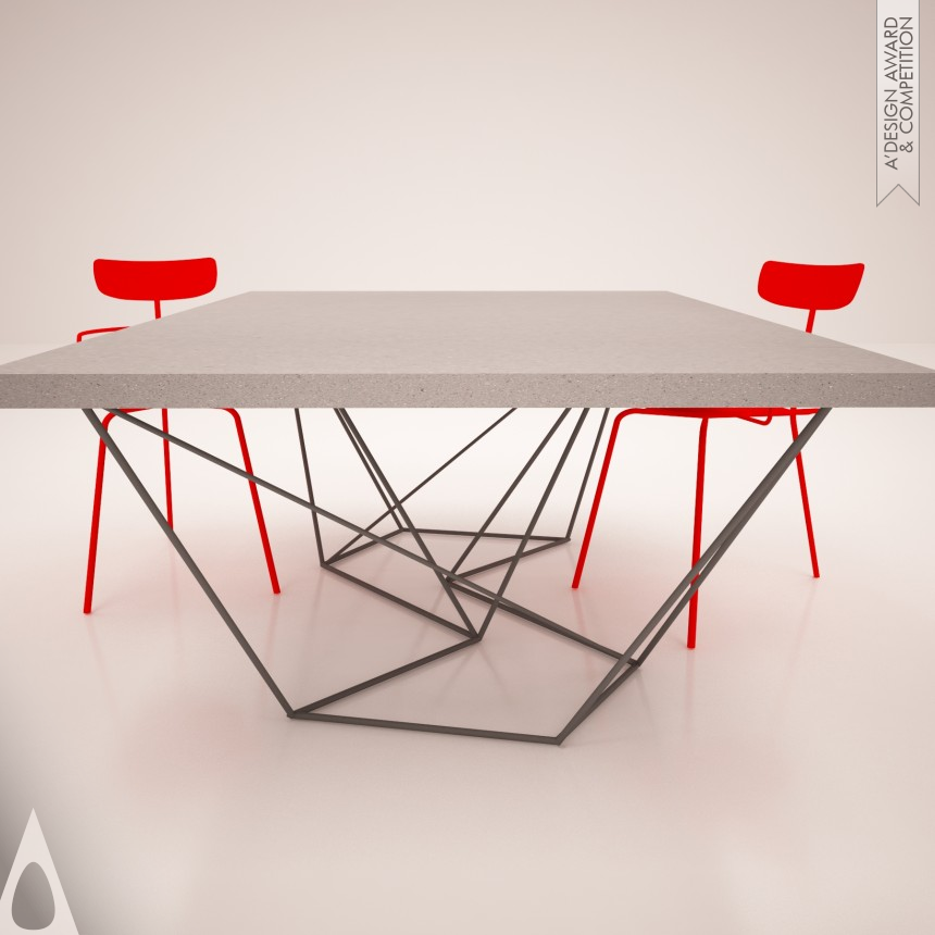 The konis table's design was conceived from a fragment's detachment from the ground. This fragment represents a concrete slab, which is deconstructed while uplifted, thus exposing its steel elements. The Konis table was named after the ancient greek word meaning dust, plaster. This structure, consisted of wood, steel and plaster is indicative of the coalescence of physical materials as well as of an optical illusion concerning gravity. The singularity of the structure is based at the application of the plaster on its wooden surface, which lends weight to it like a hovering slab.