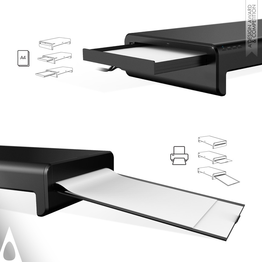 Design of printer with the concept of a furniture. This is a design of the printer with the concept of a furniture. This was designed focused on the printer design that melts into the daily life. This can be used as a monitor table or a shelf depending on the situation. The sleek design was accentuated within the restrained formation.