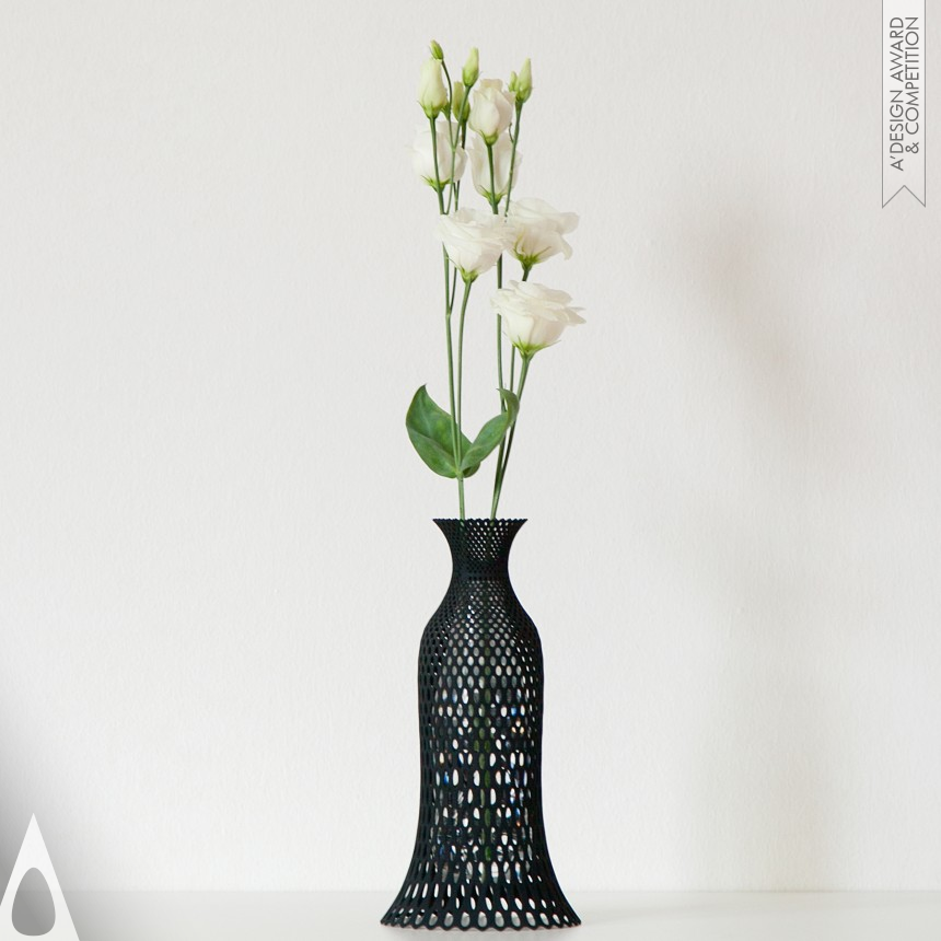 The project gives a second chance to such an unvalued object as a PET bottle, which would be normally thrown away after it has been used. The idea was to create a vase conserving only its silhouette. The vase itself represents an external shell with an inner neck fillet, so it can be screwed onto a bottle like a cap. The 3D printed structure dresses the bottle and makes it disappear under its mesh. The uniqueness of design is the result of choice of shapes, the reduced use of resources necessary for the 3D prints and the new life given to items destined to be discarded.