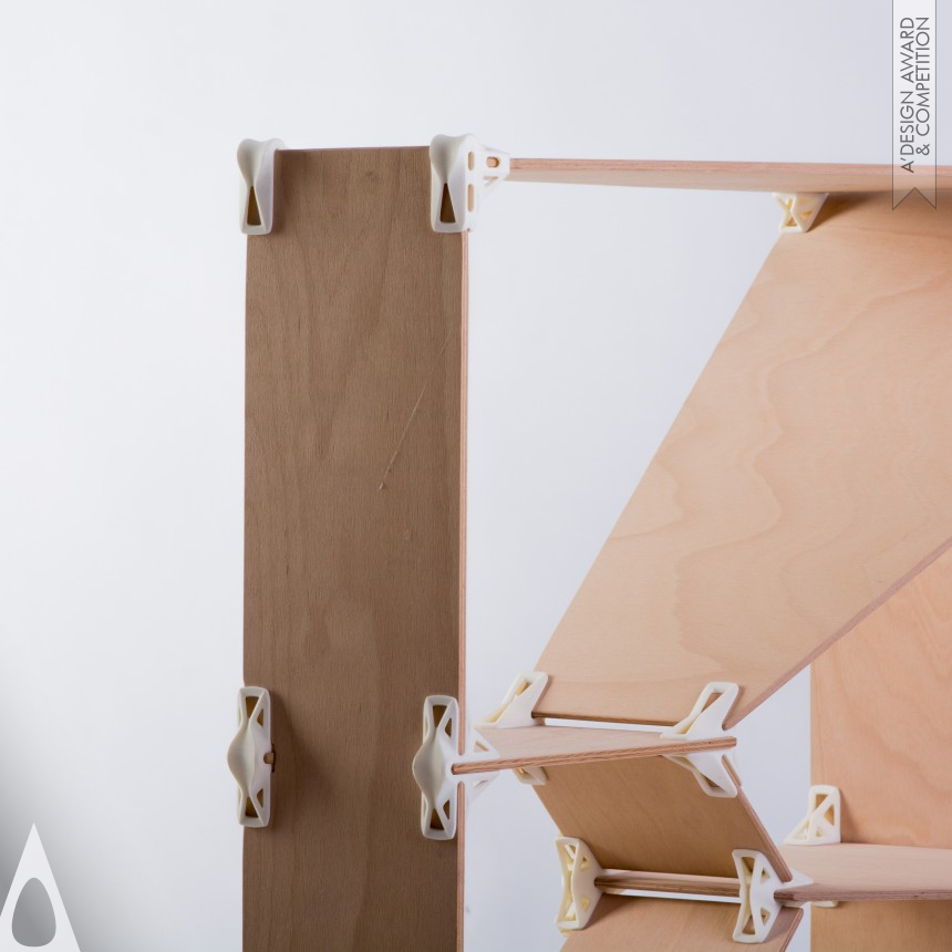 The collection provides the opportunity for the users to build furniture, installations, partitions as well. It depends on the creativity. The joints are able to be printed with any kind of three dimensional printers included fuse deposition modelling machines. It is allowed to connect 8 millimeters wide plywood sheets to each other in different angles. It contains 90, 45 and 120 degree elements. One feature of the product is that the users do not have to screw or glue the parts.