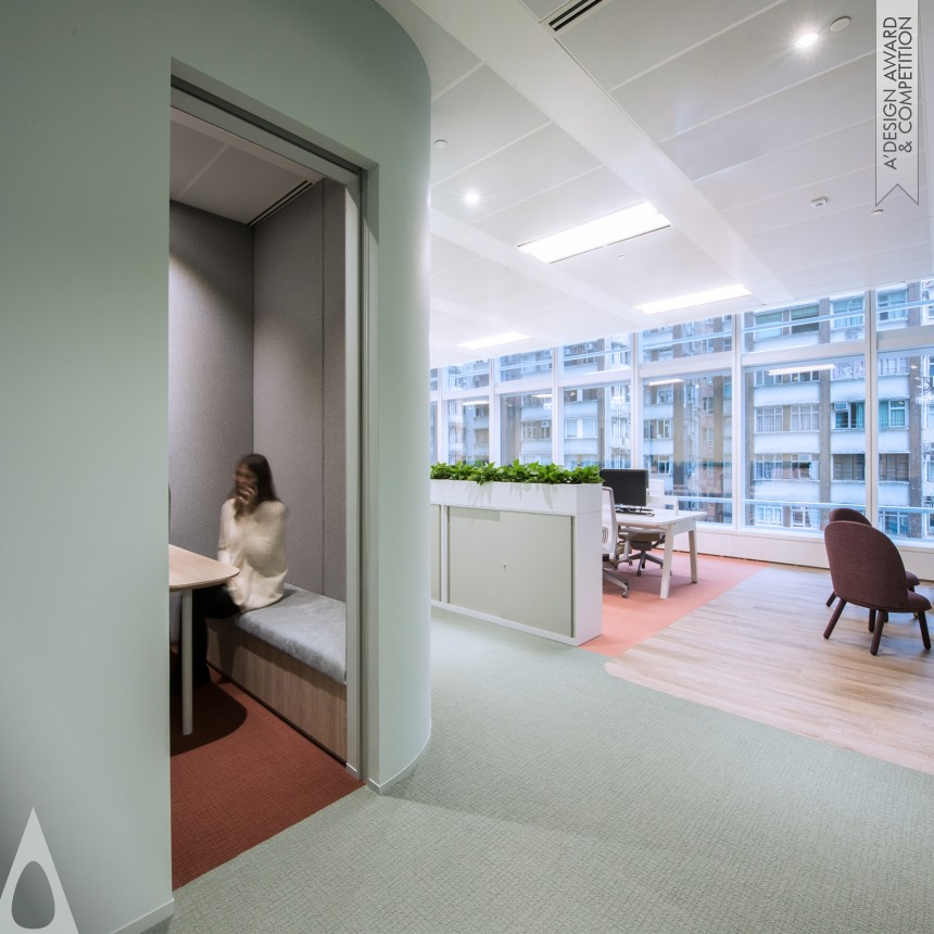 The project is an innovative Activity Based Working design for a 11,000 sqft workplace for the world leading biopharmaceutical company AstraZeneca in Hong Kong. With a clean desk policy and lockers provided throughout the open plan environment, employees have a 100 percent flexibility to choose from a variety of work settings that are sociable, semi public and private. The pill like volumetric aesthetic and colour scheme was inspired by Damien Hirst Pills Cabinets and Pill Sculptures which explored human beings relationship with science and the pharmaceutical industry.