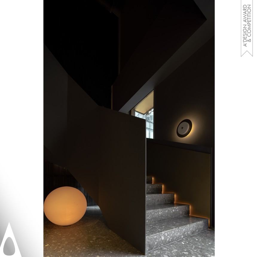 In order to break the limitation in the vertical space, the designer excavated the two-story floor to form a patio, and moved the wine rack behind the bar directly to the second floor, forming a seven-meter-high wine tower. He tried to enlarge the opening surface on the north side as much as possible, blurring the interface between indoor and outdoor. With the extended ground material integration, the outer pendulum area with more than three meters is also included in the integrated spatial visual experience, so that the space extension that was originally cramped has been greatly improved.